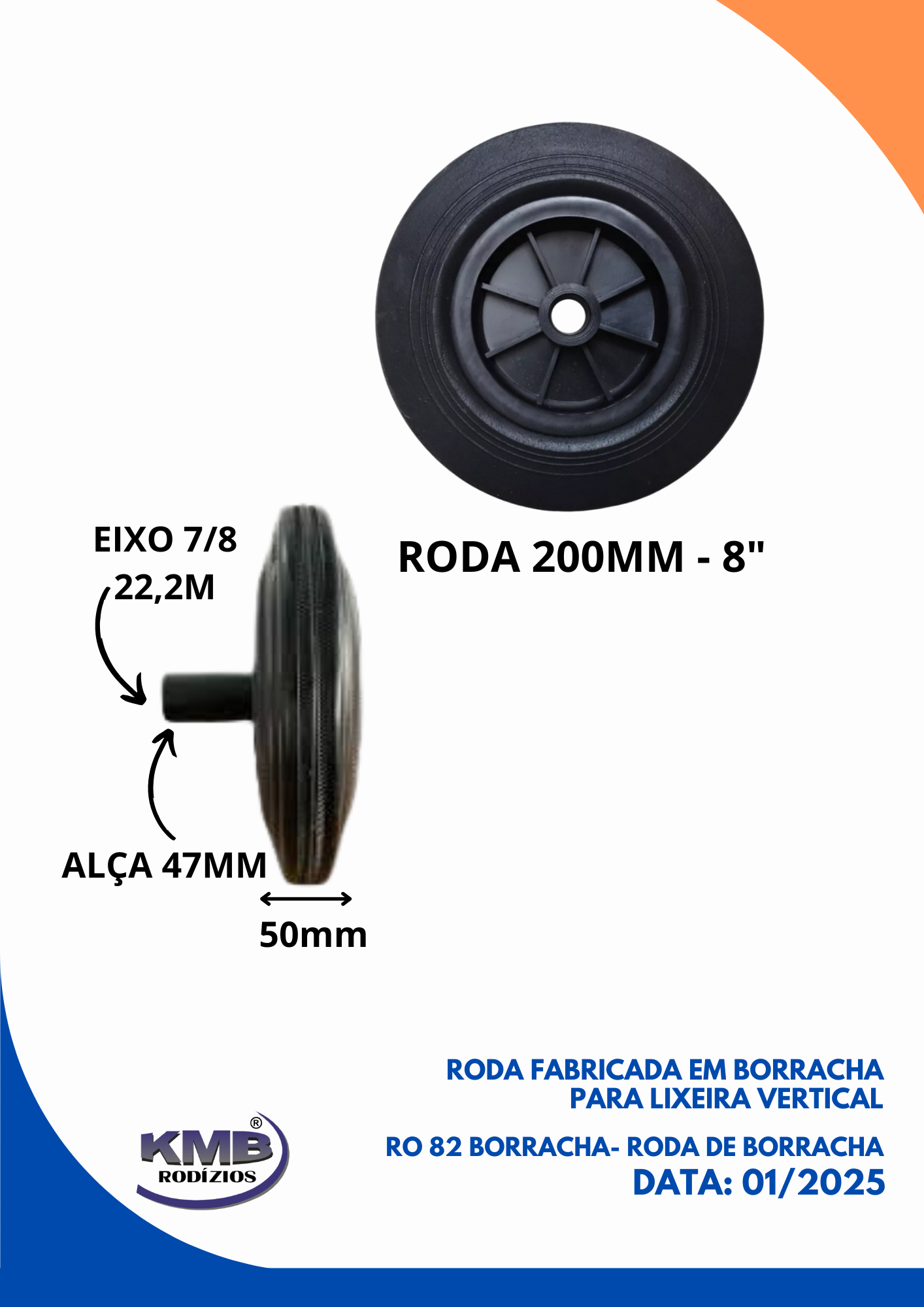Uso principal em lixeiras verticais e outros carrinhos de transporte com movimentação em asfalto, com ótima mobilidade e menor emissão de ruído e fácil instalação. Disponível na medida 8″.