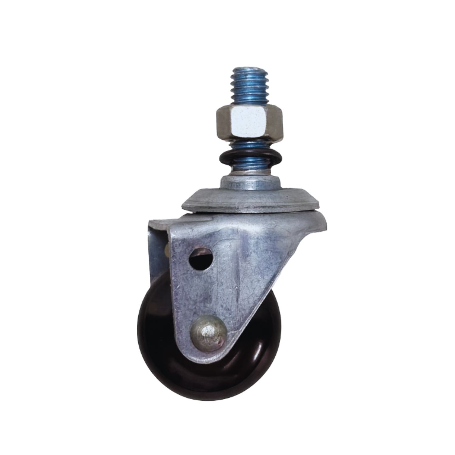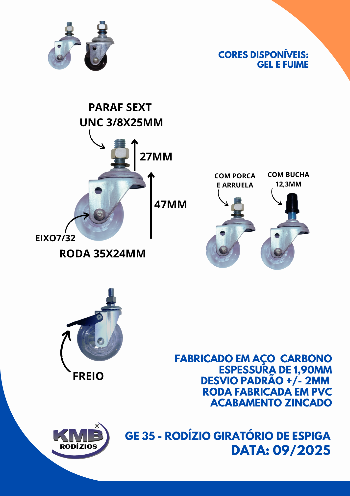 Fabricado em chapa de aço com rodas de 35mm e parafuso UNC de 3/8x25mm. Esta rodinha é aplicada principalmente à suportes, displays, bancadas, estantes, cenários e móveis diversos, com ótima qualidade, apresenta roda antirrisco, que protege o piso, com fácil instalação e boa mobilidade.