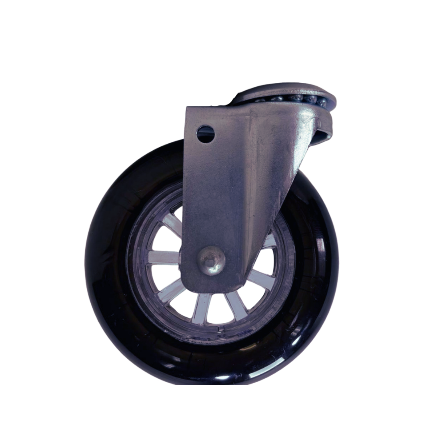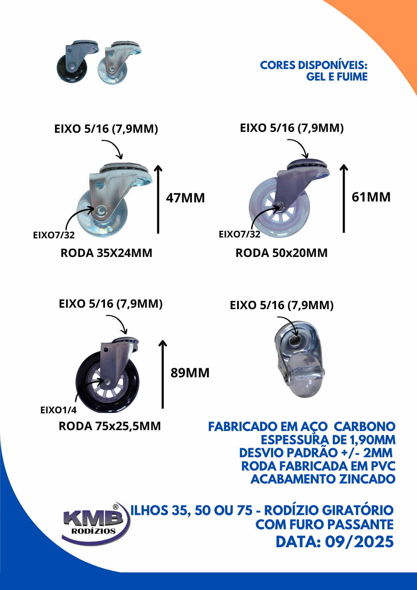 Fabricado em chapa de aço com rodas de 35 a 75mm, apresenta um furo passante no eixo de fixação. Estas rodinhas são aplicadas principalmente à vasos e suportes de alumínio, com ótima qualidade, apresenta roda antirrisco, que protege o piso, e boa mobilidade.